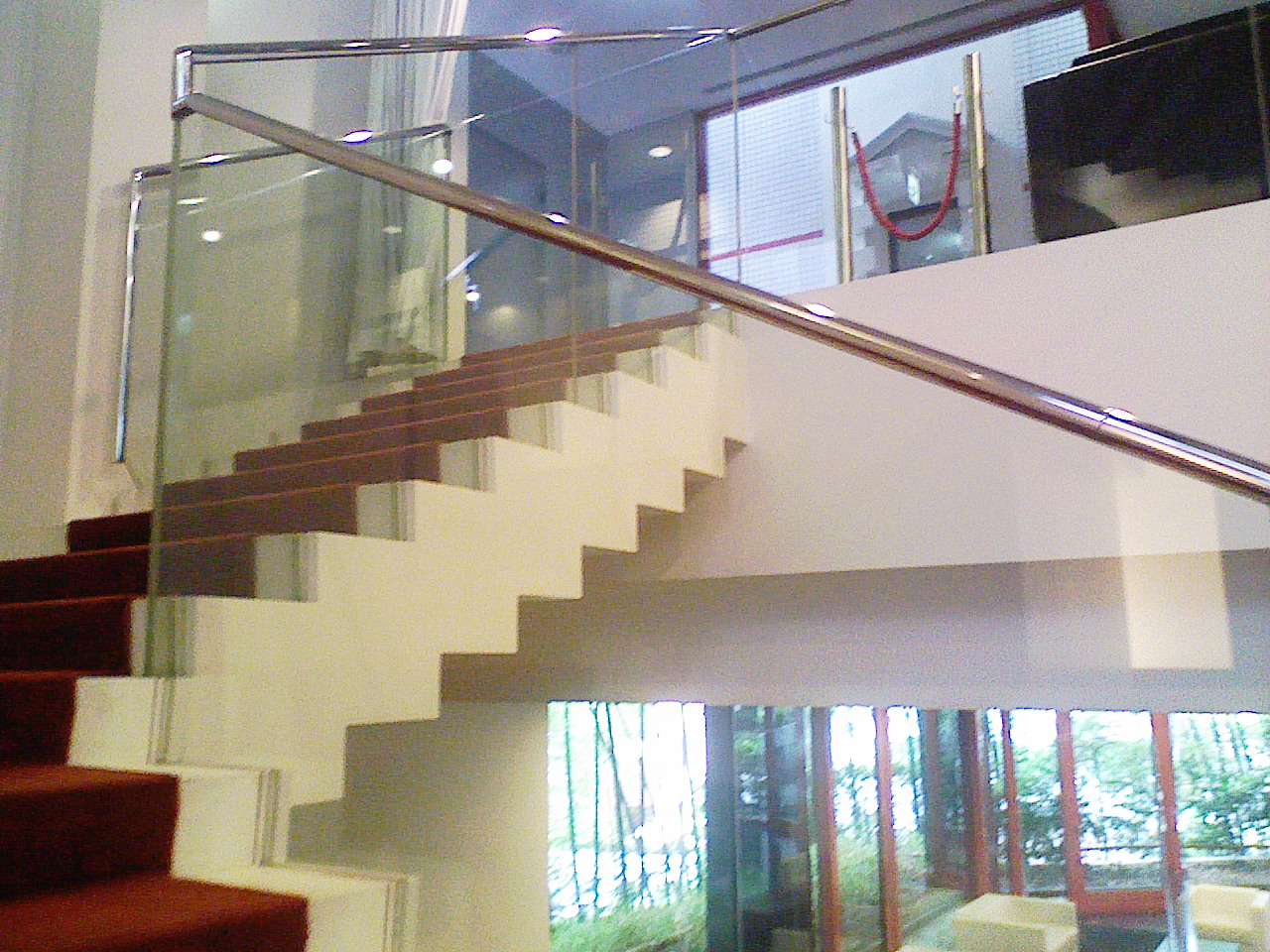 階段の手すりガラスに飛散防止フィルム【SH2CLAR】施工