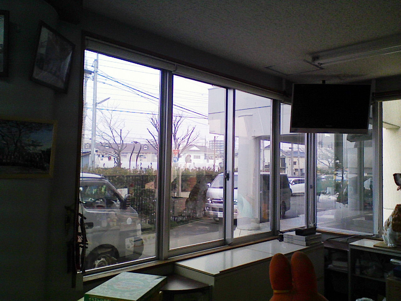 外から見ると鏡で、室内から見るとしっかりと外が見える不思議なフィルムです。