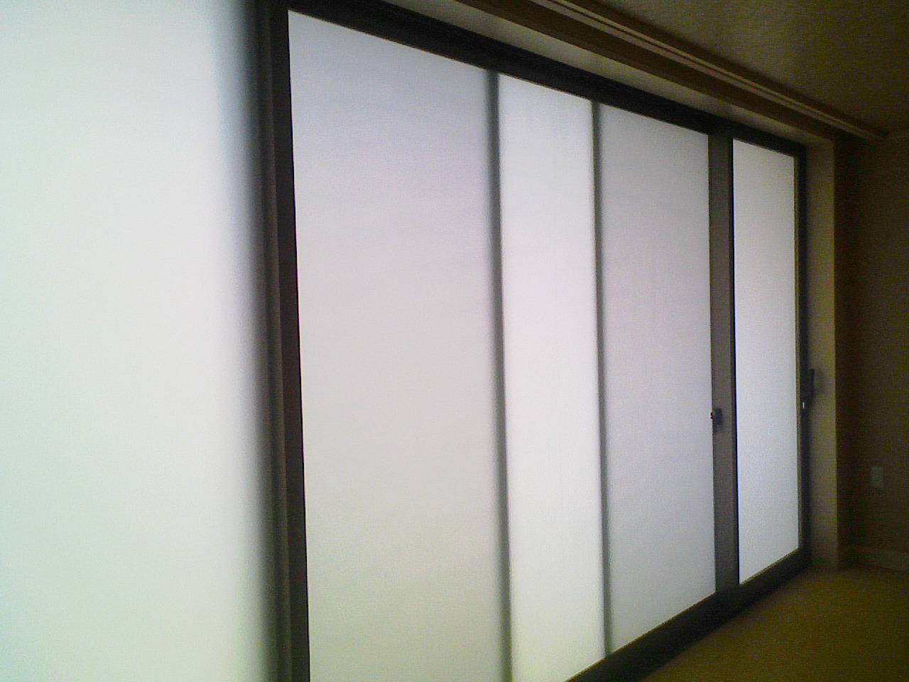 写真の色の濃い部分は、外側に網戸があるため、色が違って見えますが、全て同じガラスフィルムを貼り付けております。