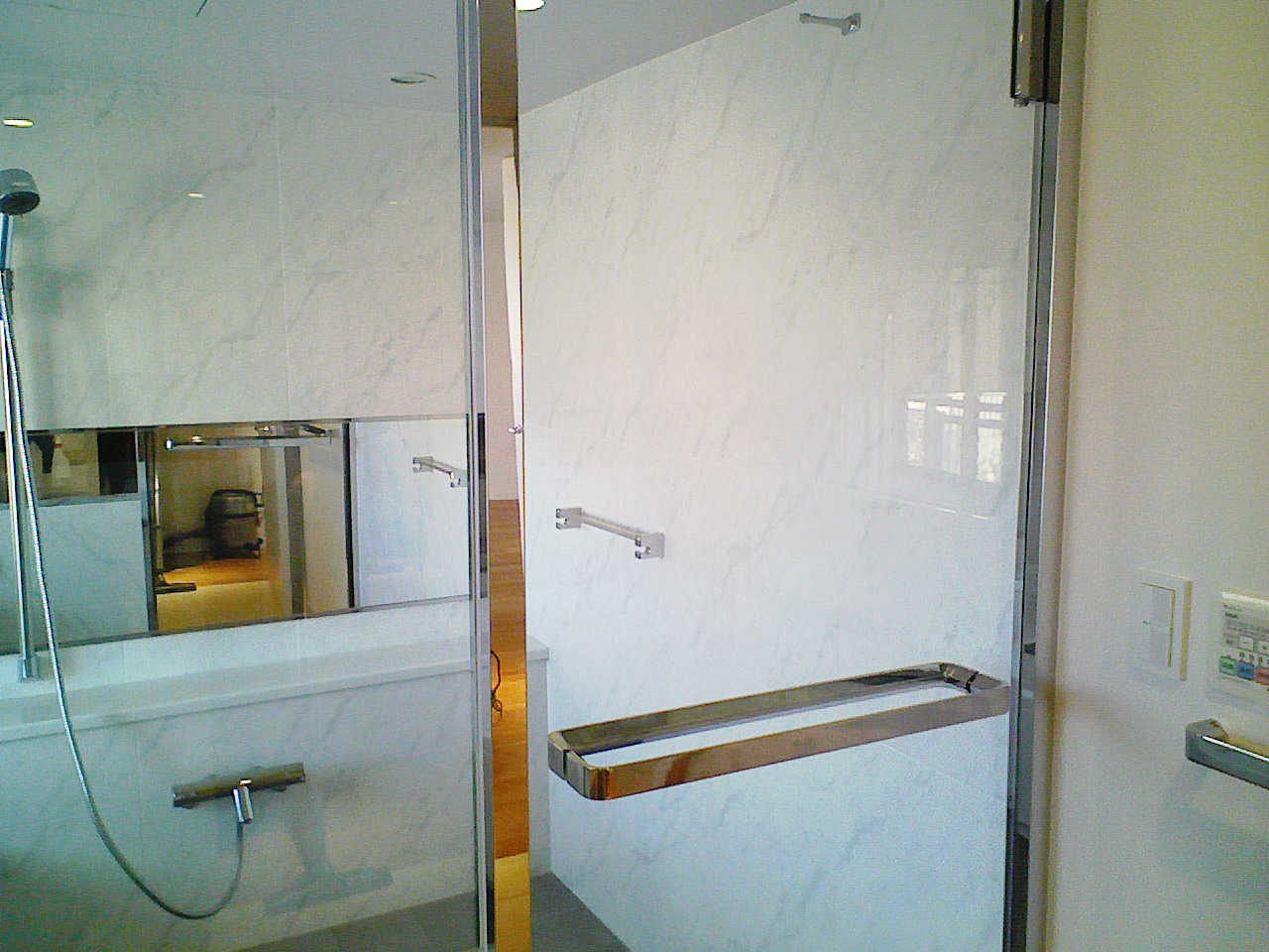 最近では、浴室のガラスに透明強化ガラスを取り付けていることが多いようです。